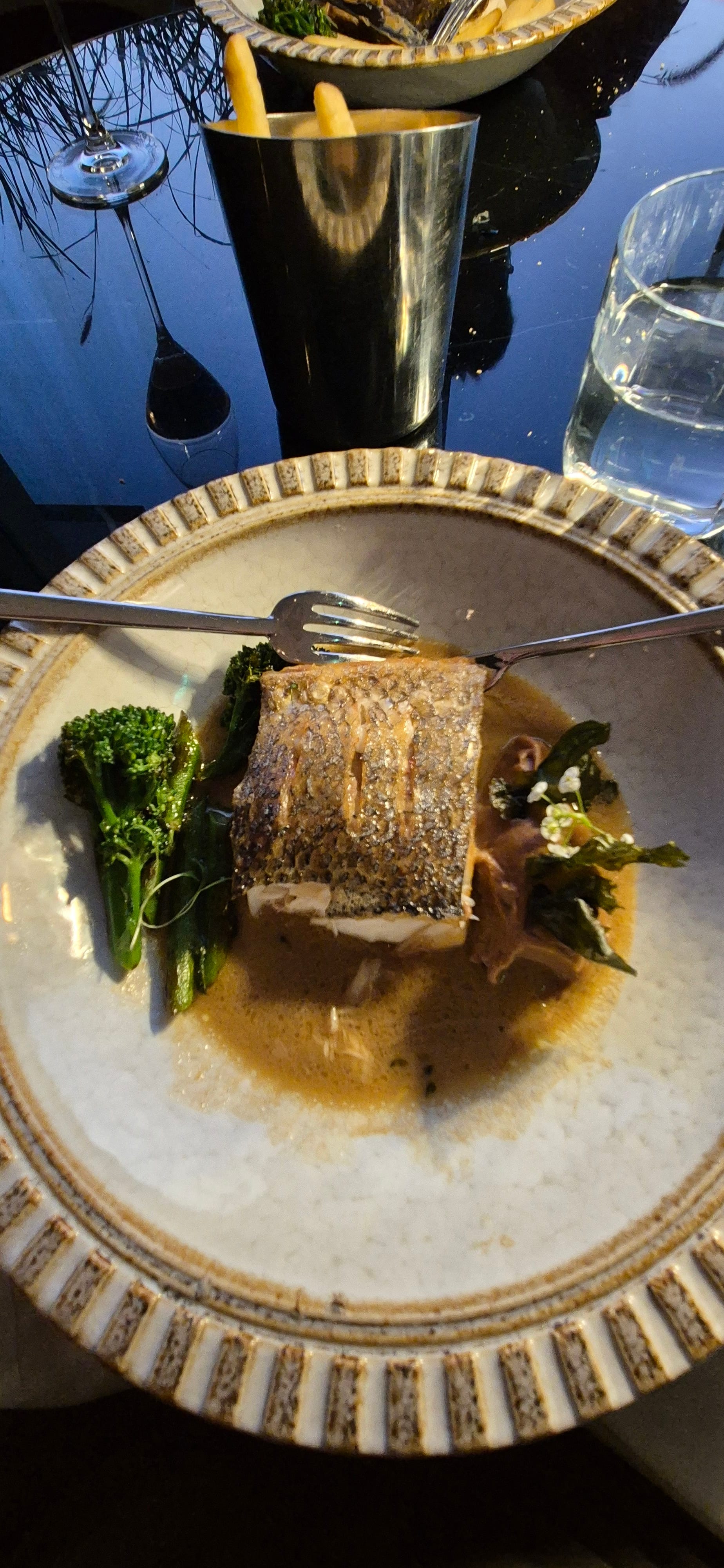 We steadily worked through a bottle of Rosé and our mains of grilled then baked sea-bass with baby broccoli and celeriac pureé in a champagne and olive oil sauce.