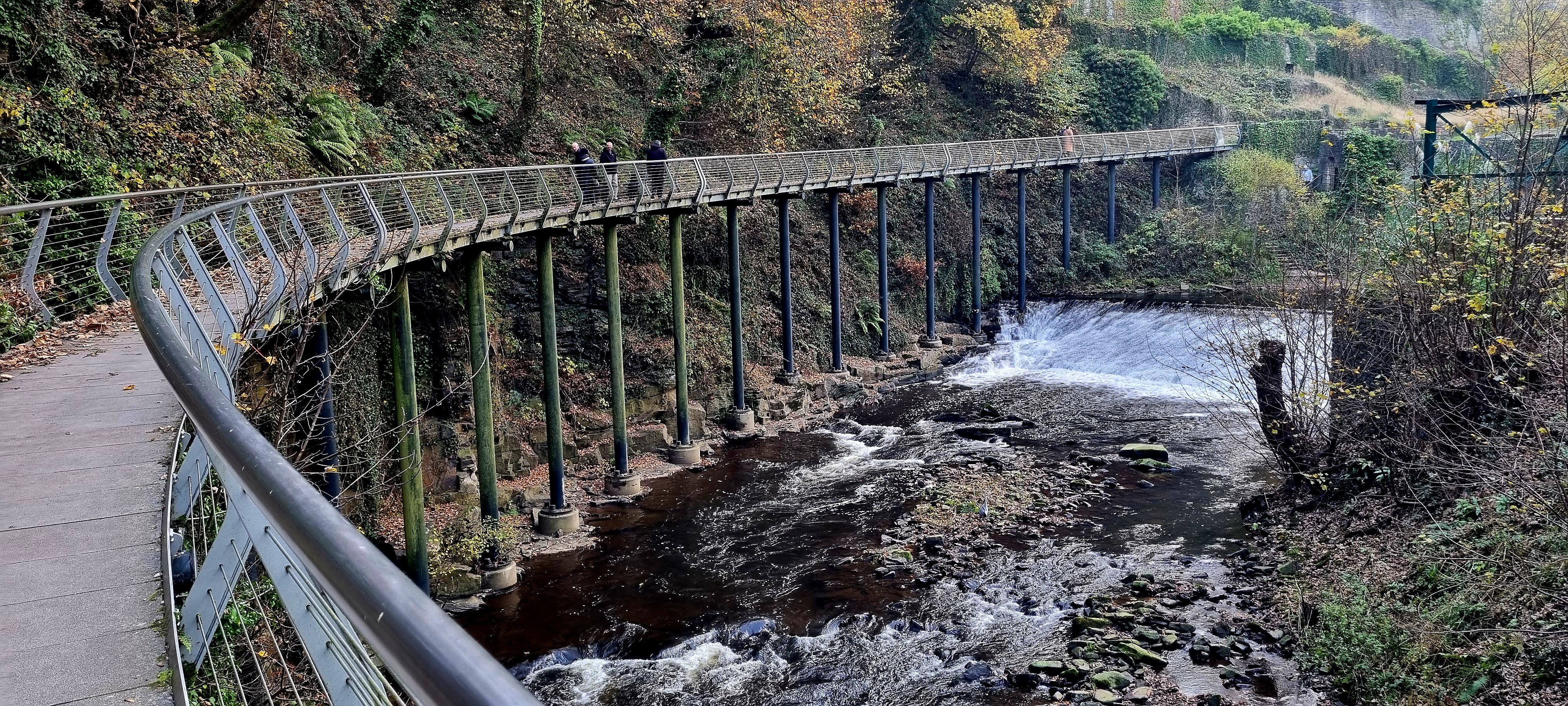 To reach this area, called the Torrs, you have to travel along the Millennium Walkway an inspired piece of architecture which sits alongside the embankment carrying the train into New Mills Central.